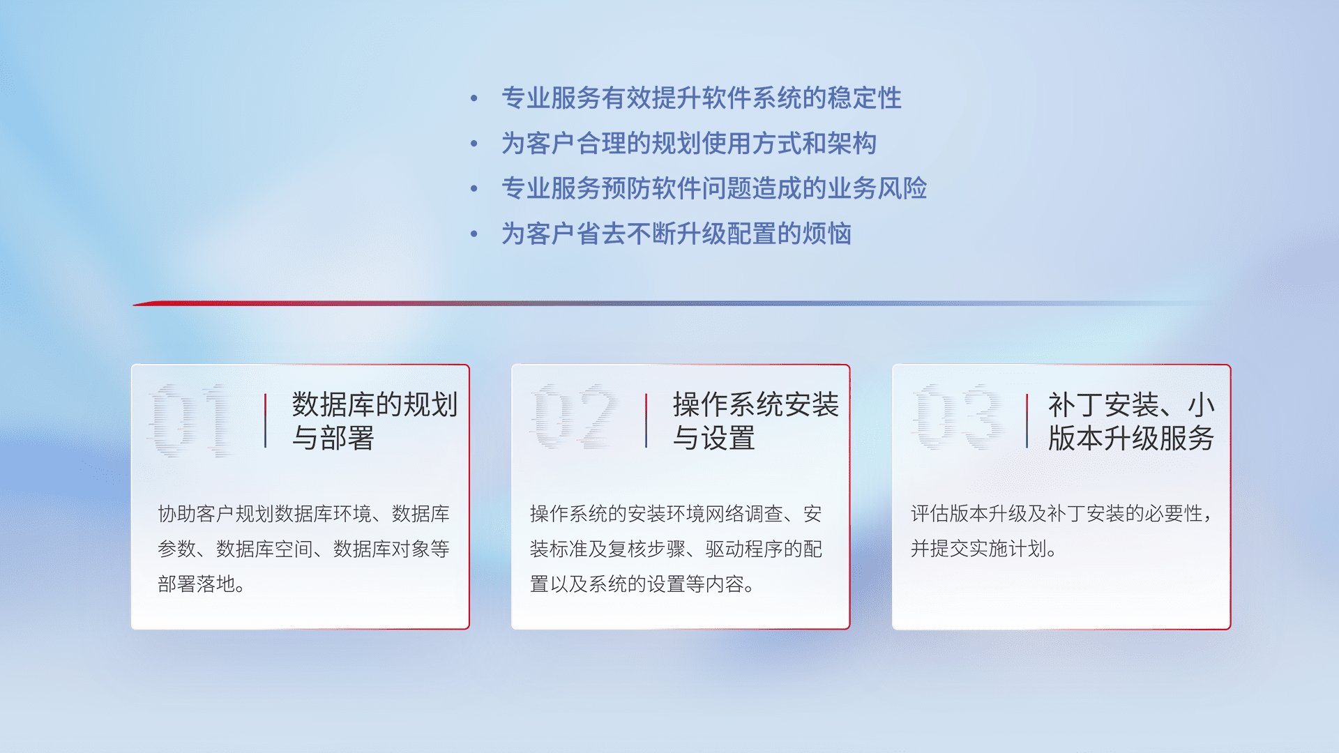 为客户提供软件规模升级、、、、快速部署、、按需配置的专业服务,,从数据库的规划与部署到操作系统的安装与设置,,再到补丁安装和小版本升级提供支持。。。。
