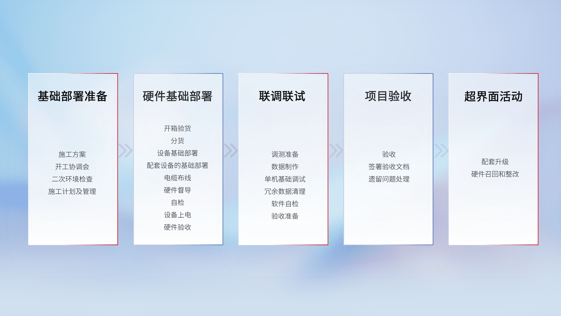 从基础部署准备、、硬件基础部署、、联调联试、、、项目验收、、、越界面活动的全过程可追溯,,保证施工质量和进度。。